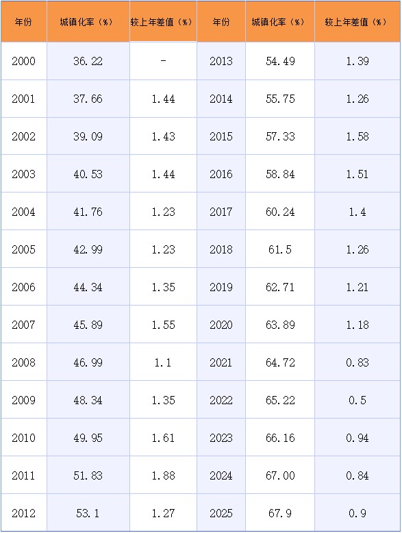 进入2020年后,我国城镇化发展开始降速。数据显示,2021~2024年,我国城镇化率每年的增量都低于1%。根据相关机构预测,2025年的城镇化率增长情况也将延续这一态势。